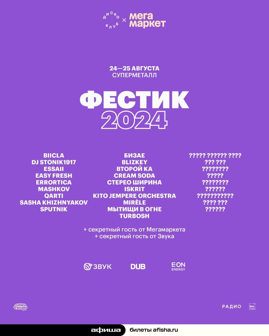 Фестик-2024» — ежегодный музыкальный фестиваль, организованный командой «Диско-клуба», состоится 24 и 25 августа 2024 года в московском пространстве «Суперметалл». В программе заявлены выступления более 19 артистов, включая Cream Soda, Mirèle, DJ Stonik1917, Iskrit, Biicla, Easy Fresh, Sputnik и Sasha Khizhnyakov. Организаторы также обещают появление «мегакрутых секретных гостей.